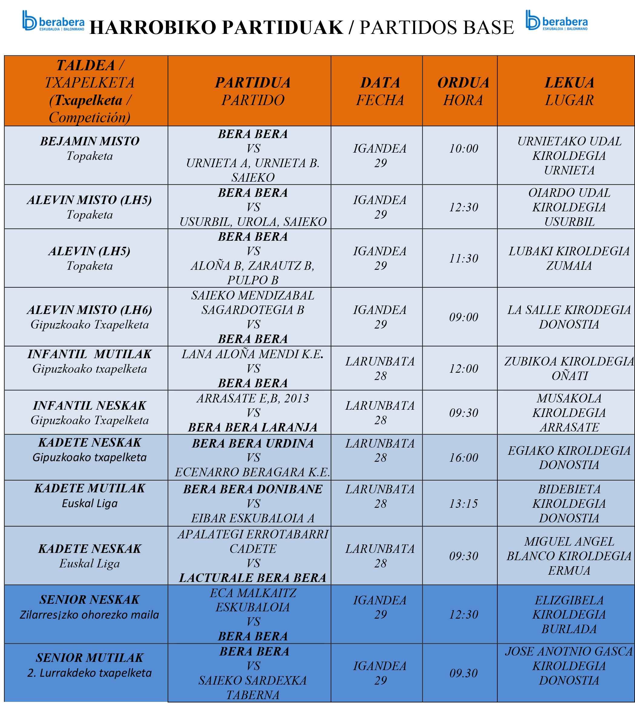 Euskal ligan, Lacturale Bera Bera kadete neskek Ermuan jokatuko dute larunbat goizean eta Bera Bera Donibane kadete mutilek, Bidebietan 13,15etan. Senior mutilak, aldiz, Gascan igandean 9,30etan , super amara Bera Berak Beti Onak taldearen aurkako partida baino lehenago.