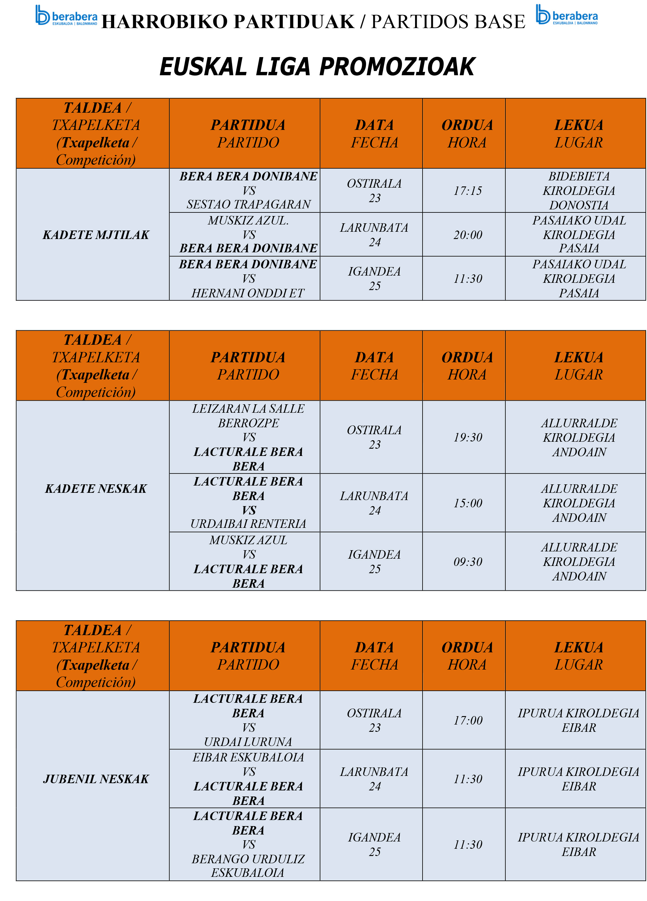 Euskal promoziak alde batera utzita, sei partida jokatuko dituzte Bera Bera Eskubaloiko harrobiko taldeek. Zilarrezkoan, Kukullaga gainditu ostean Bera Berak Loiun izango du hitzordua, larunbatean 18etan, Urdaneta azken sailkatua bisitatuz.