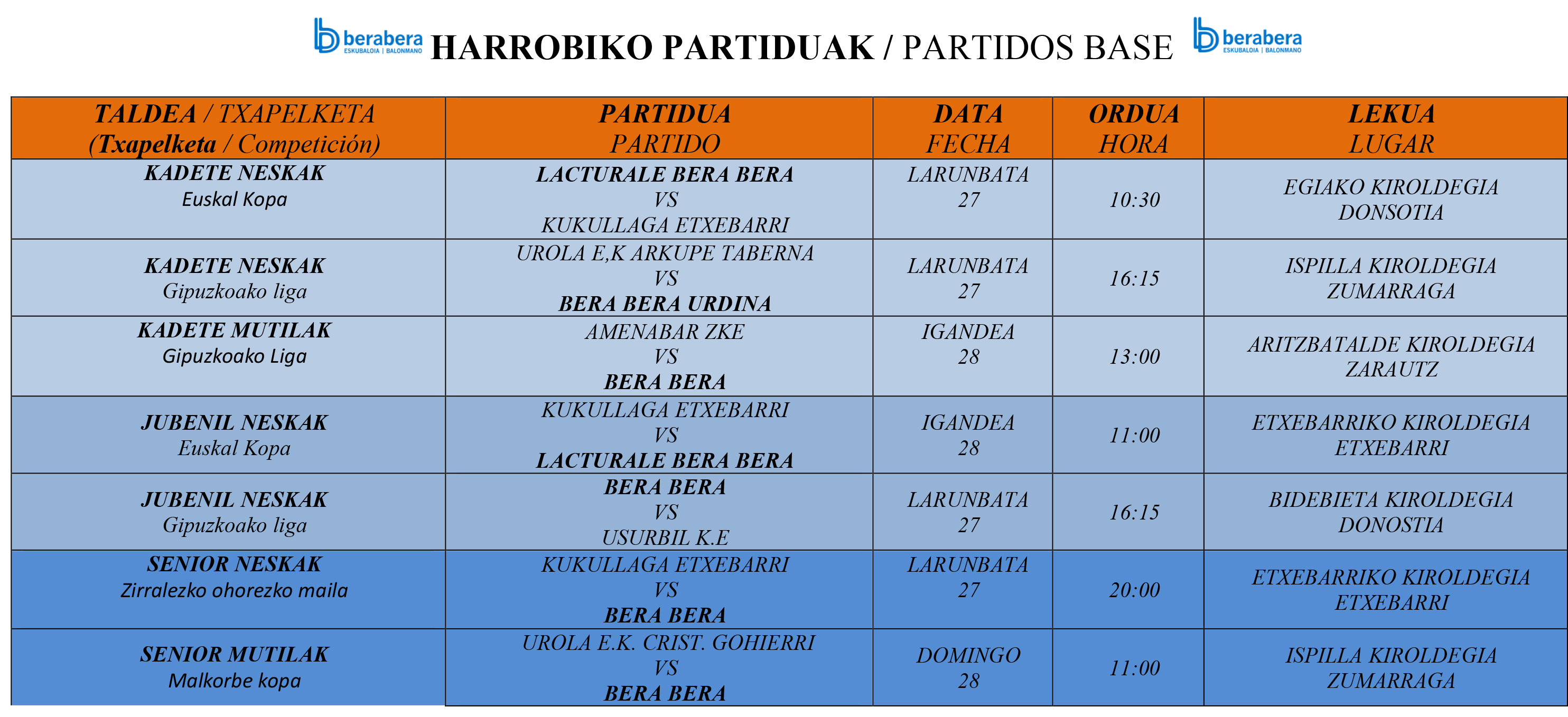 Zilarrezko mailako ligari ekingo dio asteburu honetatik aurrera Bera Berak, Kukullaga Etxebarri taldeari bisita eginez larunbatean 20etan. Horrez gain, beste sei norgehiagoka. Bizkaiko herri honetan ere Lacturale Bera Bera jubenil taldeak Euskal Koparekin hitzordua du igandean 11etan eta Euskal Kopan baita ere, Lacturale Bera Bera kadete taldeak Kukullaga hartuko du Egian, larunbatean 10,30etan, kanporaketa iraultzea zaila badu ere.