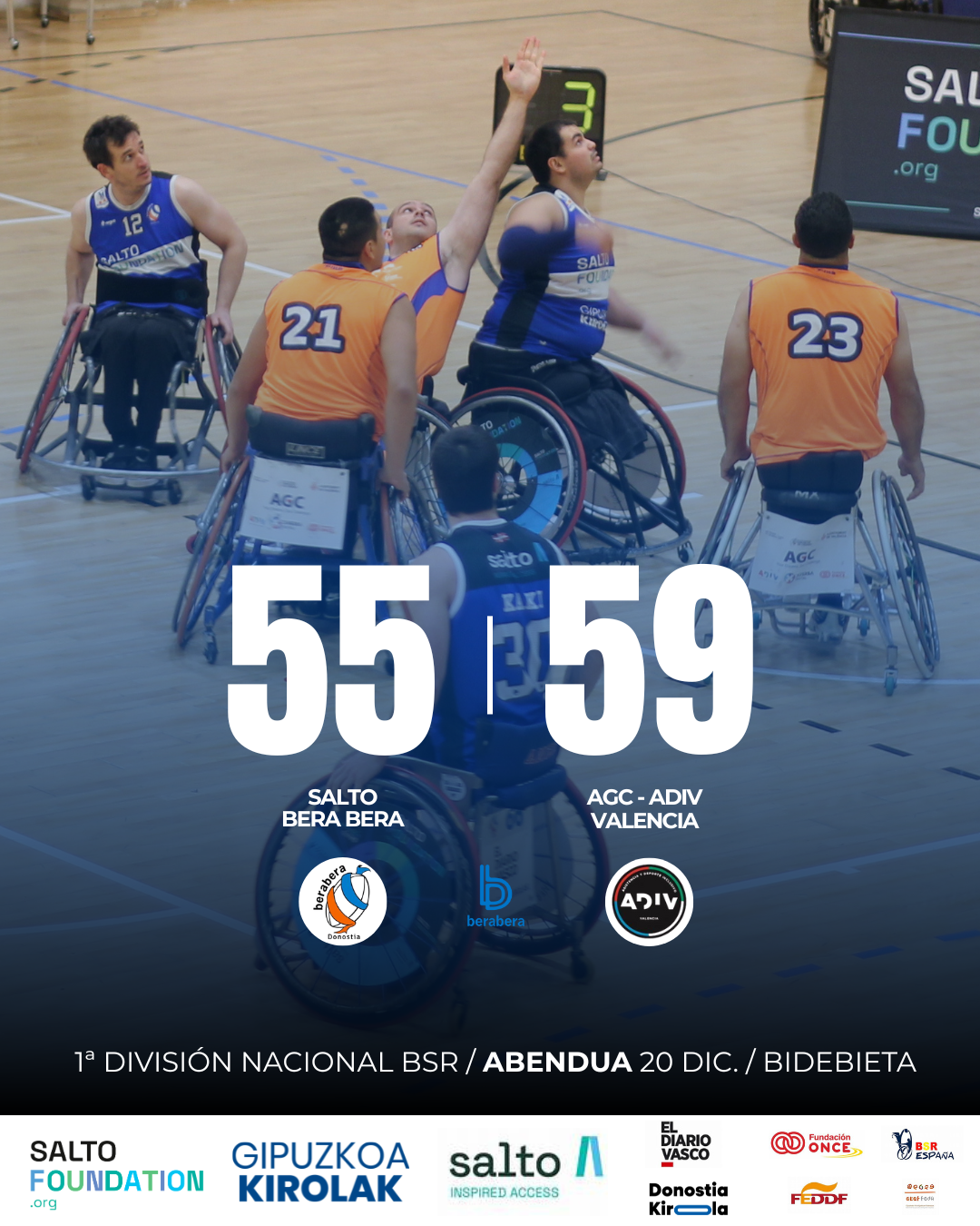 Salto Bera Bera cayó por 55–59 ante AGC–ADIV Valencia en un encuentro muy intenso, con un desenlace ajustado y sensaciones encontradas para el conjunto donostiarra. La primera parte estuvo marcada por una defensa tímida en cuanto a intensidad, con ambos equipos concediendo canastas relativamente fáciles. Al descanso, el marcador reflejaba un tanteo elevado para la categoría, con alrededor de treinta puntos por equipo.