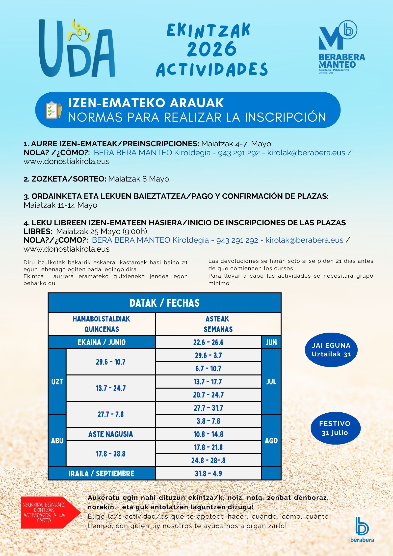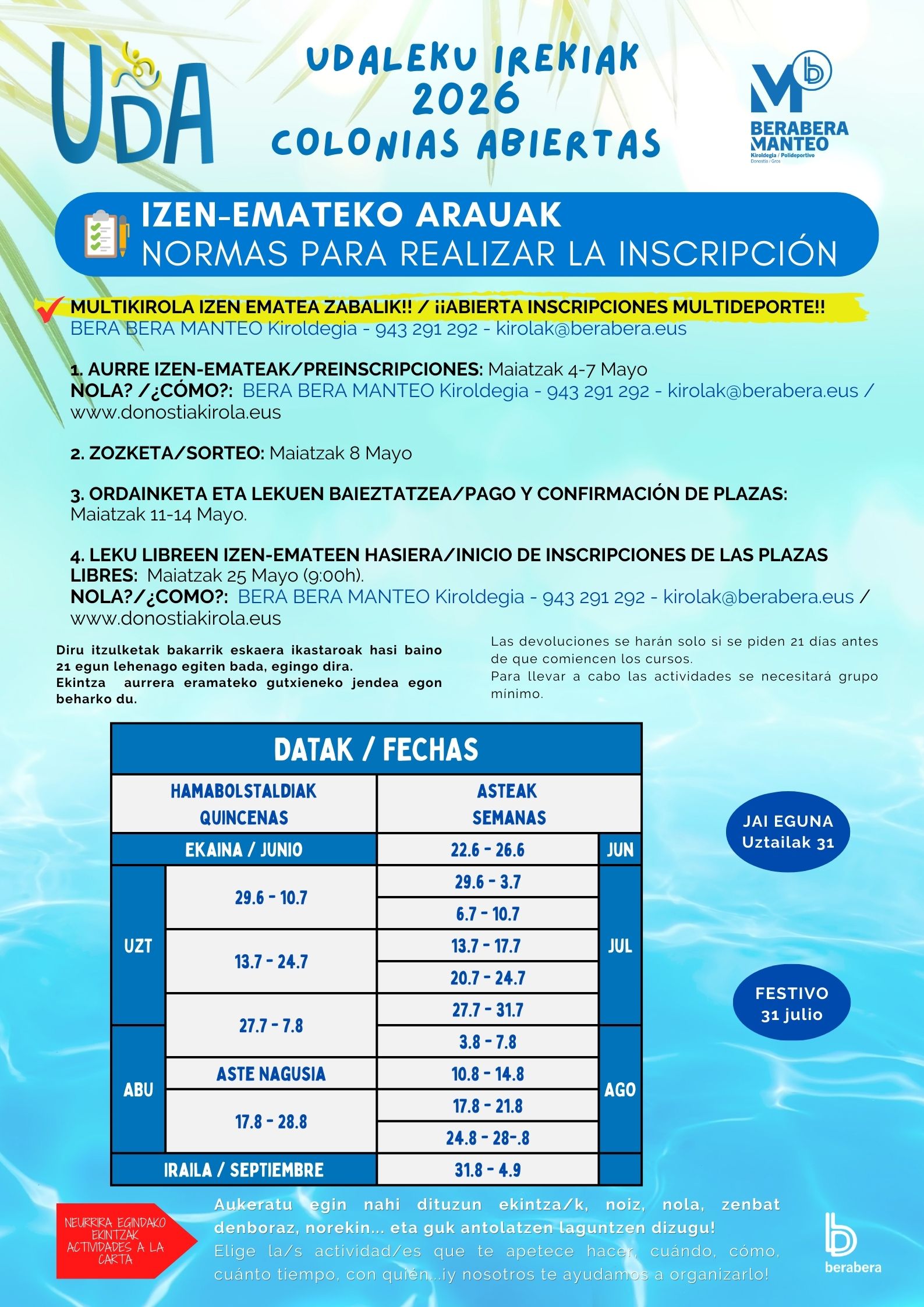 Aurten ere online izen-ematea egitea posible izango da, horretarako geroz eta erabilgarriagoa izango zaizuen Manteo Bera Bera aplikazioa (APP ANDROID - APP APPLE) erabiltzea edo WEB orriaren bitartez egitea gomendatzen dizuegu . Izen-ematea horrela egin ezin duzuenak 943 291292 telefonoan, email bidez,