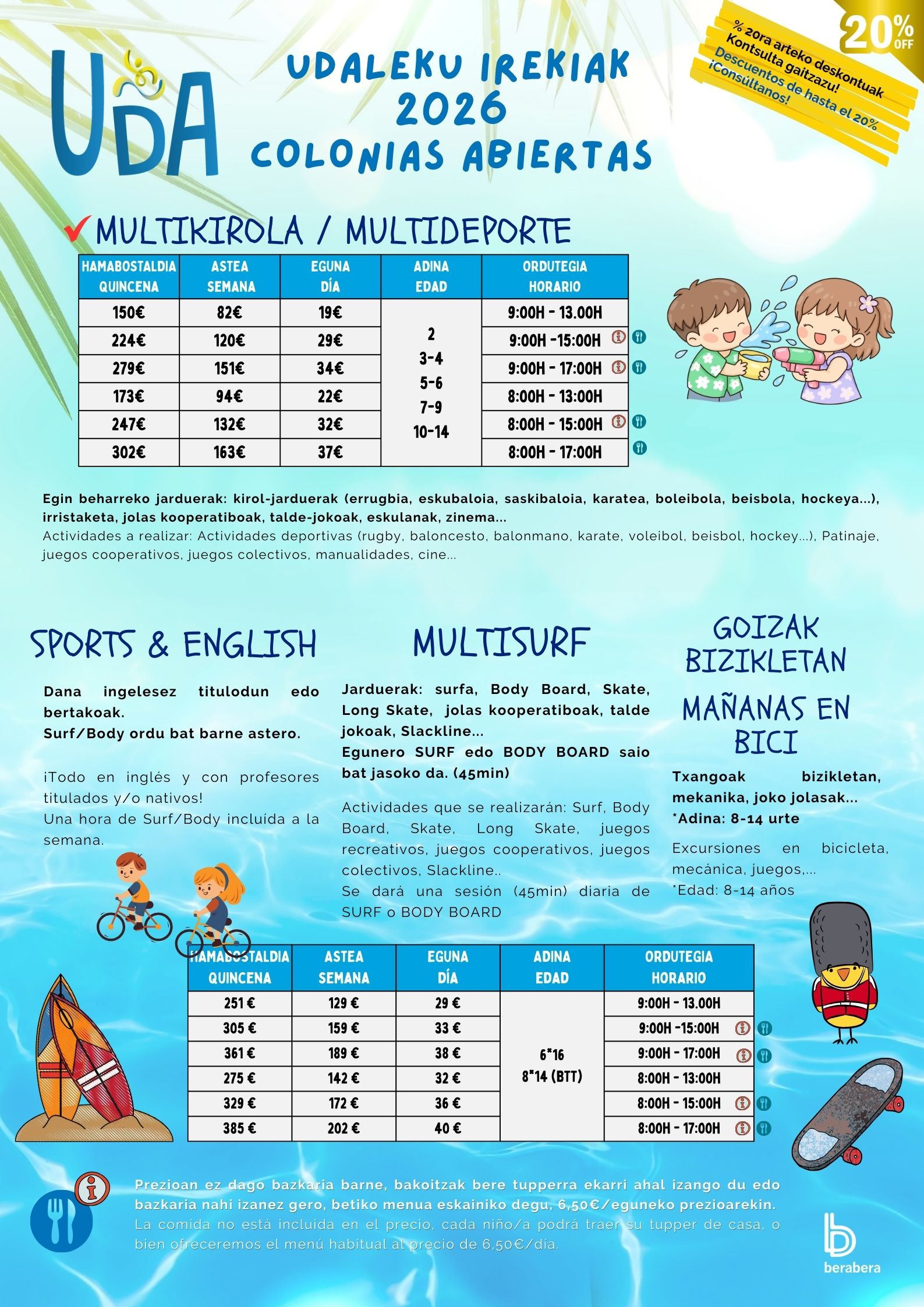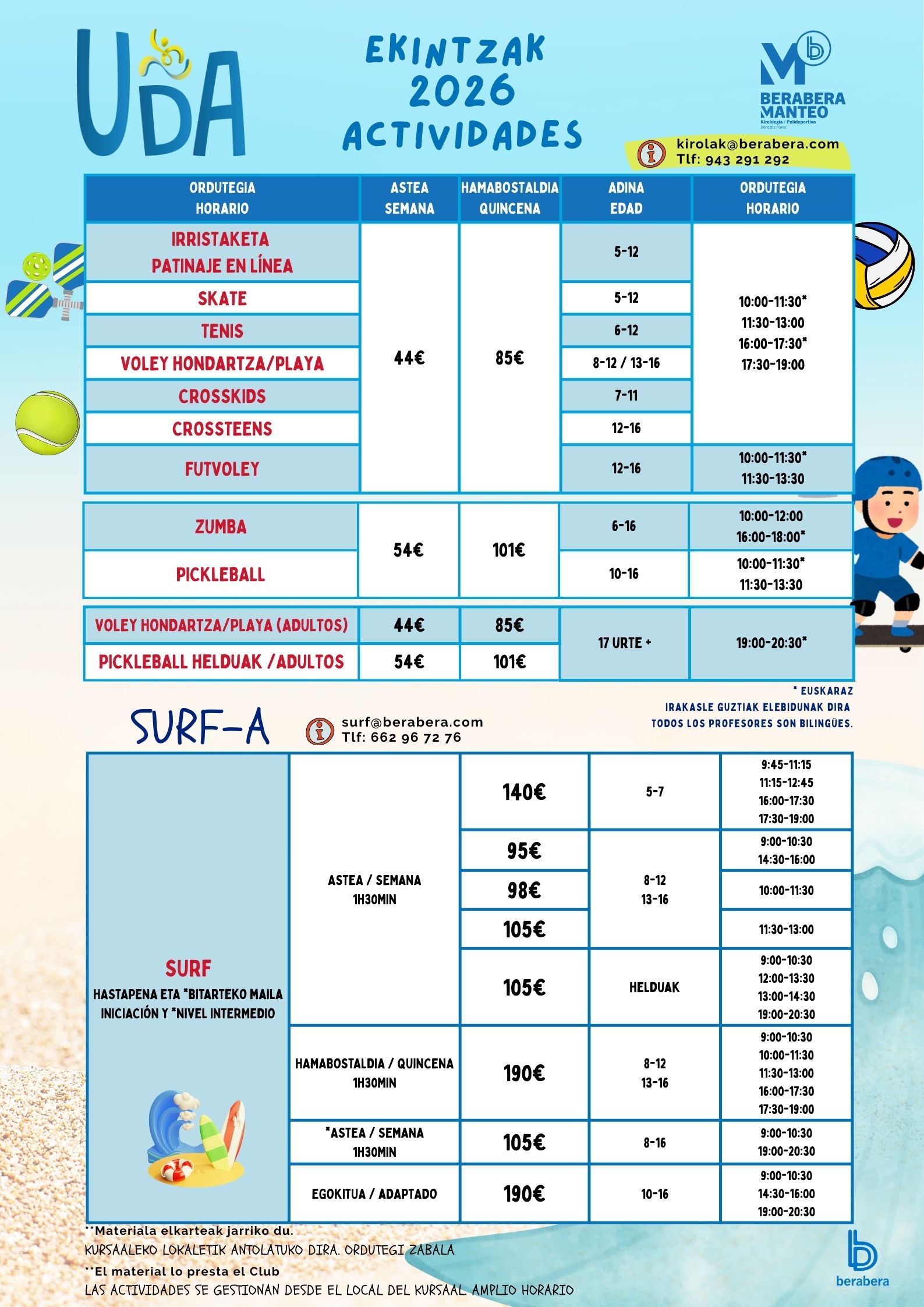 ✓ Kirol eta jarduera espezifikoen eskaintza: surf, irristaketa, skate, tenis, hondartzako boleibola, crosskids, crossteens, futbol-boleibola, zumba eta pickleball.