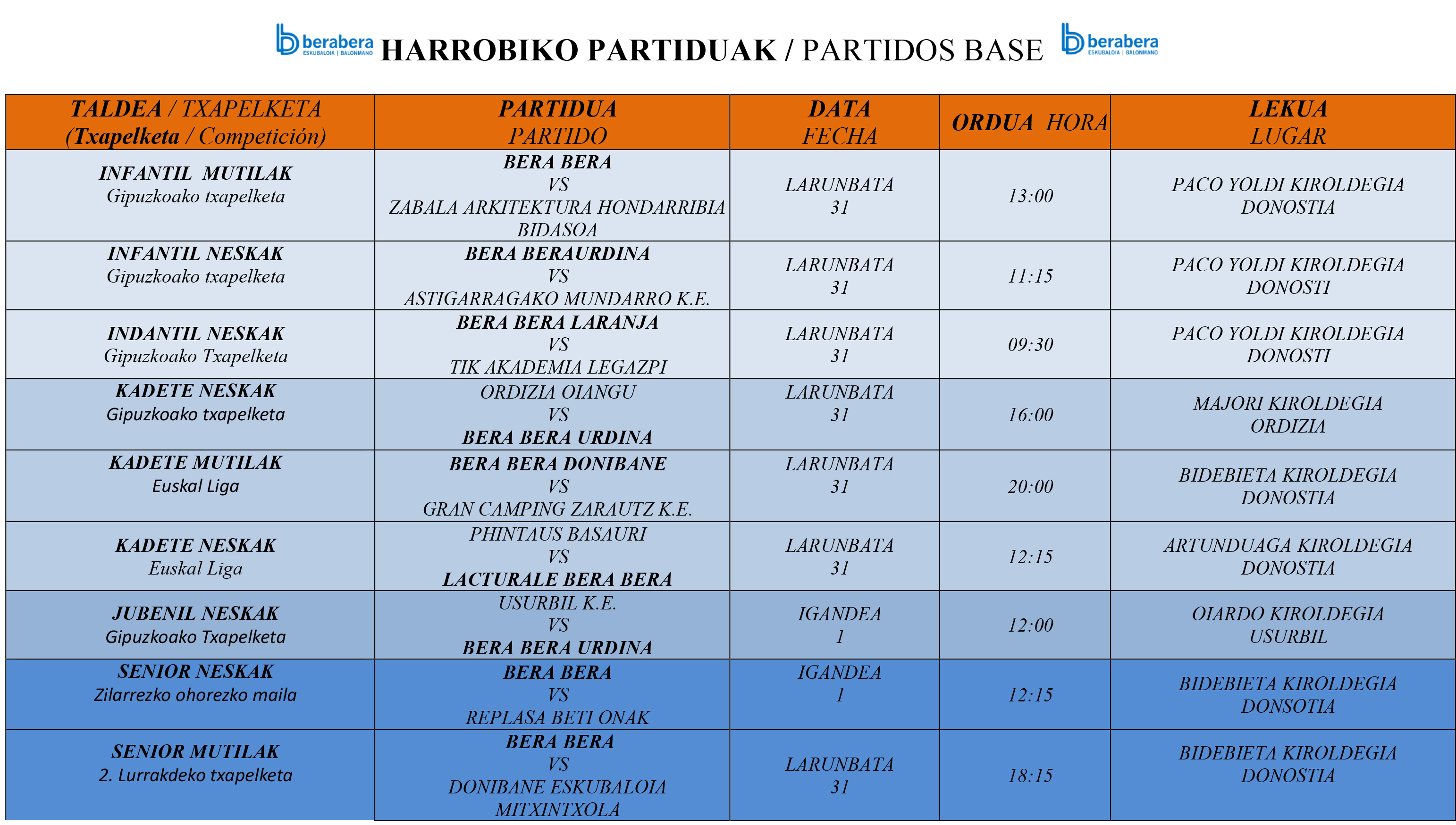 Euskal ligan, Lacturale Bera Bera kadete nesken taldeak Basaurin ekingo dio bigarren faseari. Bera Bera Donibane mutilen kadete taldeak, berriz, Gran Camping Zarautz hartuko du larunbatean 20etan Bidebietan euskal ligan debuta eginez.