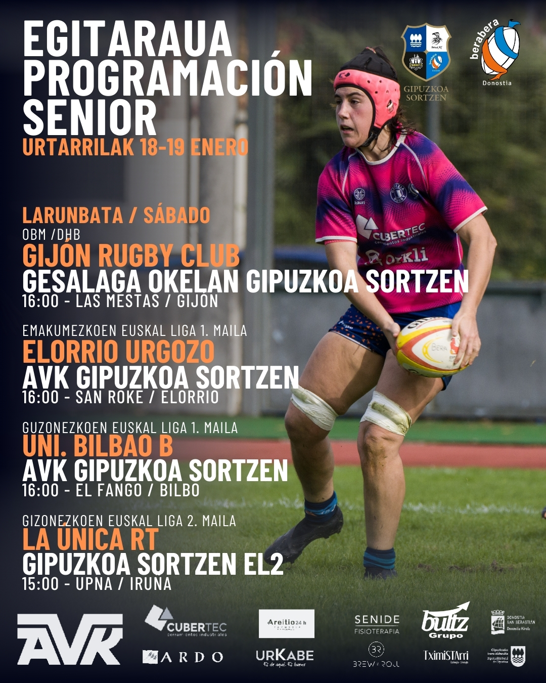 Planazo el sábado por la tarde en el Kote Olaizola de Anoeta con los partidos del senior de primera vasca masculino y femenino, que jugarán contra los segundos y las líderes respectivamente. El tercer equipo jugará en Lasarte. Los y las S16 comienzan la segunda vuelta tras clasificarse para el campeonato de España, S14 jugará el sábado al mediodía en Puio y la Bultz Bera Bera rugby eskola disfrutará otra jornada en Arrasate el domingo.