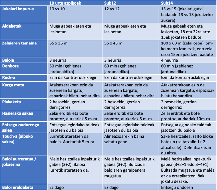 “Arauak adin desberdinetara egokituta daude, baloiarekin hasita, kategoriaren arabera tamaina aldatzen baita”, zehaztu du Lalok. “10 urte azpikoetan ez dago melerik, touche-ik edo oin-jokorik. 12 urte azpikoetan kontzeptu tekniko horiek lantzen hasten gara, eta 14 urte azpikoetan errugbia nagusienaren oso antzekoa da”.