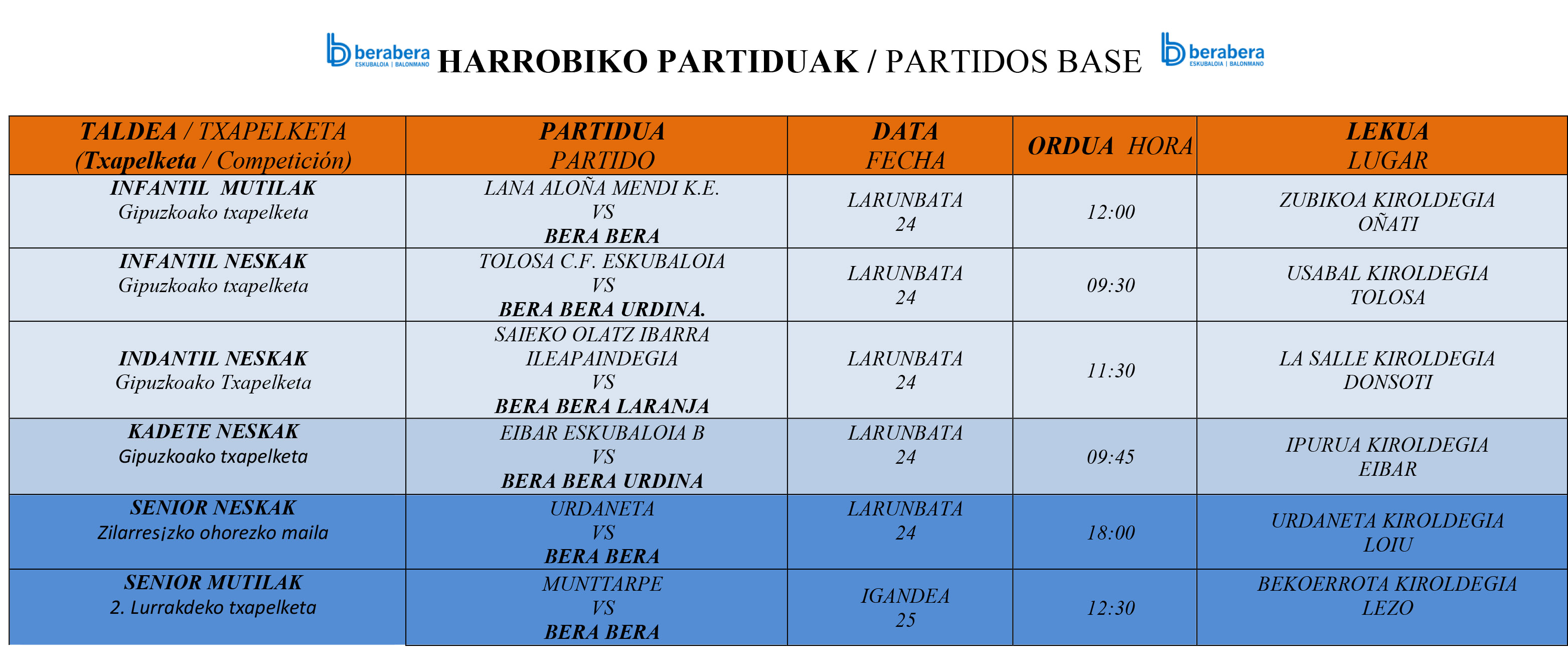 Euskal promoziak alde batera utzita, sei partida jokatuko dituzte Bera Bera Eskubaloiko harrobiko taldeek. Zilarrezkoan, Kukullaga gainditu ostean Bera Berak Loiun izango du hitzordua, larunbatean 18etan, Urdaneta azken sailkatua bisitatuz.