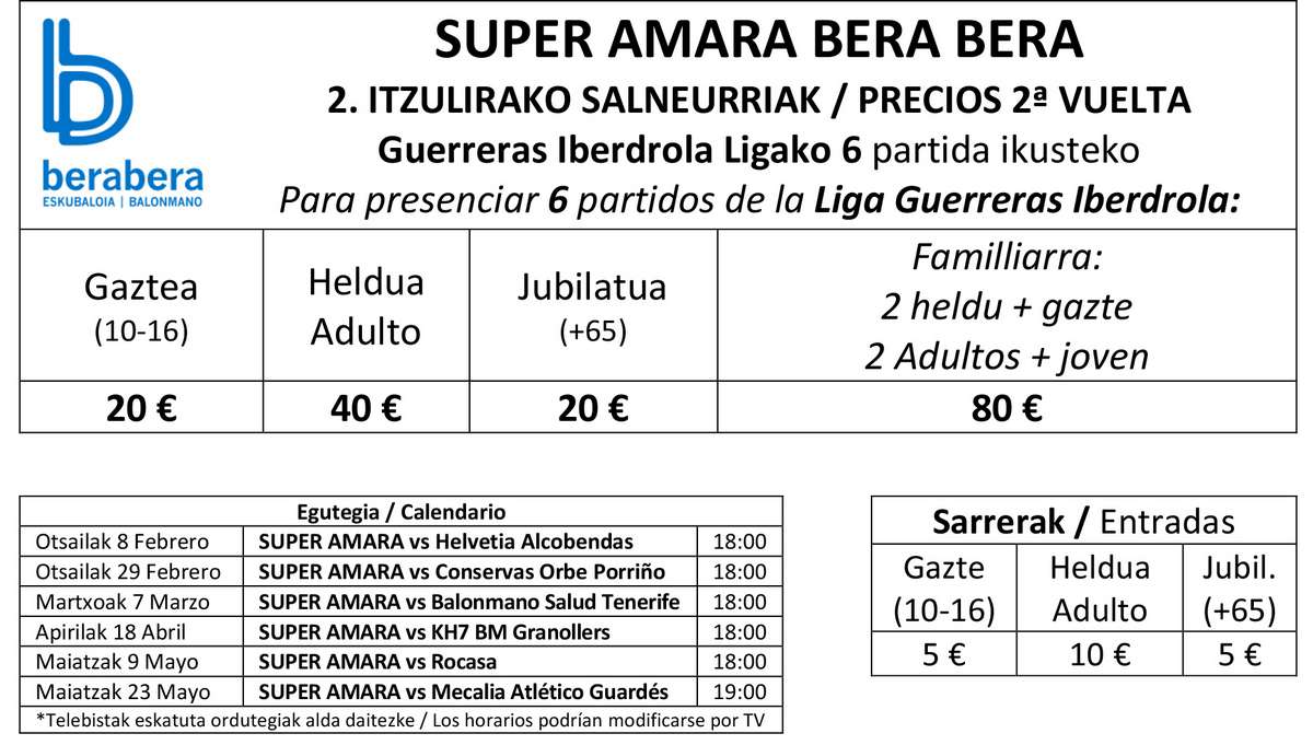 Honako formulario osatu SUPER AMARA Bera Berak bigarren itzulian Donostian jokatu behar dituen sei norgehiagokak ikusteko, helduek 40 eurotan, jubilatuek eta gazteek (10-16 urte) 20 eurotan eta familiaek (80 eurotan). Irakurri albiste osoa